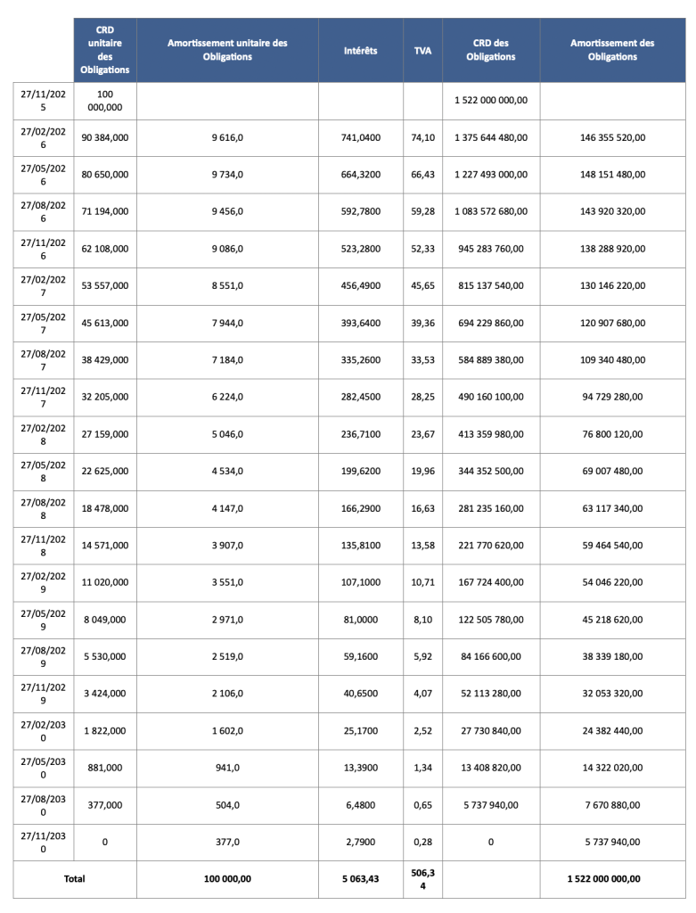 Le tableau ci-après indique l’échéancier des Obligations émises à la date d’émission. Les montants figurant dans le présent document sont exprimés en MAD.